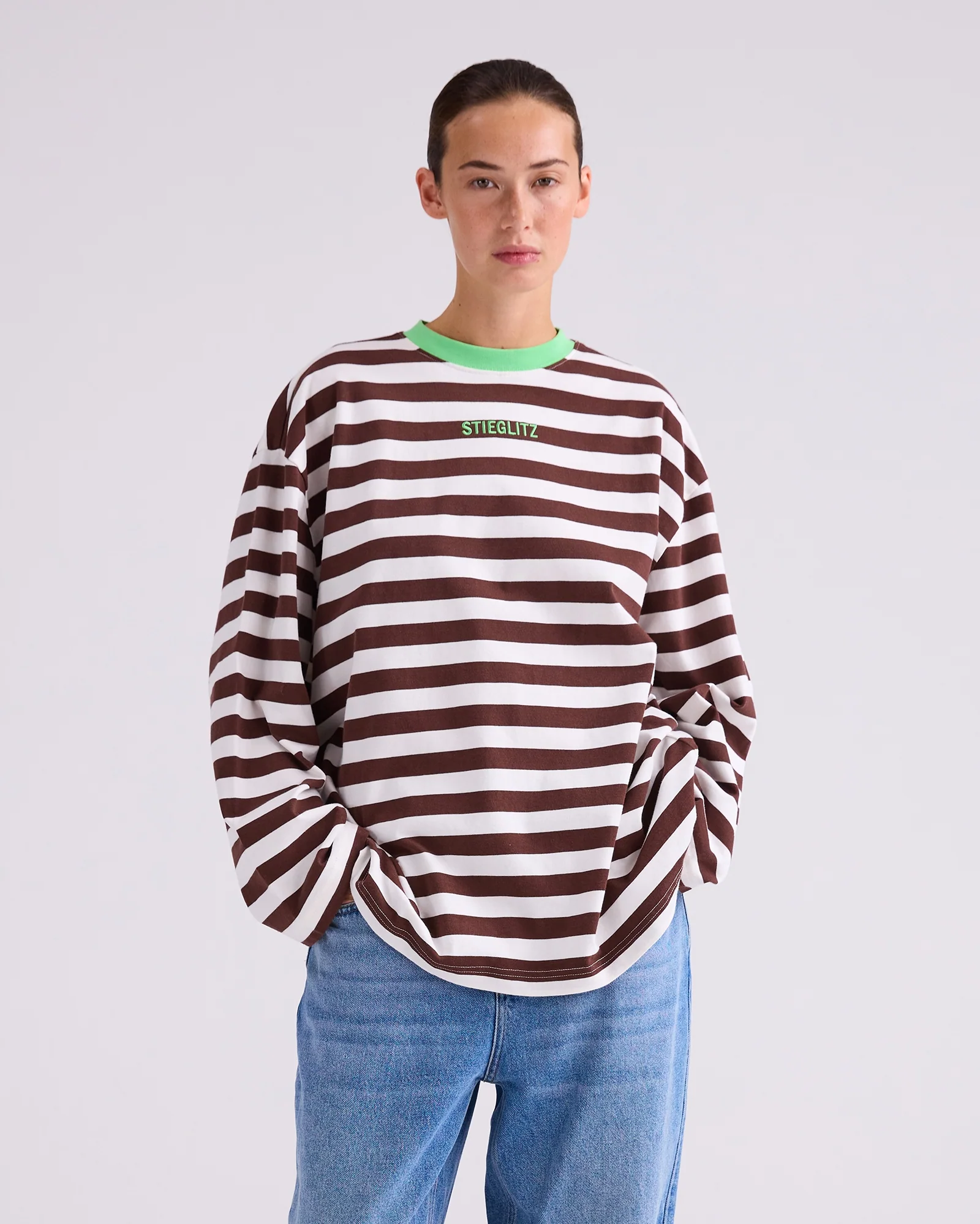 De iconische Janita Skate Longsleeve is terug. De originele bruine kleur krijgt gezelschap van twee nieuwe tinten: bordeaux en navy. Oversized fit met wijde mouwen, opvallende strepen en een geborduurd logo.