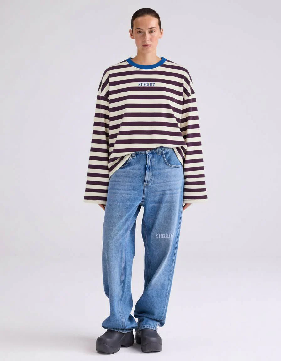 De iconische Janita Skate Longsleeve is terug. De originele bruine kleur krijgt gezelschap van twee nieuwe tinten: bordeaux en navy. Oversized fit met wijde mouwen, opvallende strepen en een geborduurd logo.